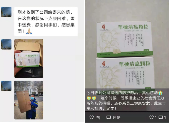 2021年,新冠疫情再度爆發(fā),香港旭日集團(tuán)及常宏本部心系員工健康,選了經(jīng)過2020年初抗疫前線應(yīng)用的有效藥品「葦梗清瘟顆?!梗ā競浒肝奶枴冠M藥制備:Z20200002000)發(fā)放給全體員工。1月初,常宏將首批顆粒發(fā)放給一線工人,后受疫情影響,在石家莊市快遞恢復(fù)的第一時(shí)間,14日起陸續(xù)將藥品以郵寄的形式發(fā)放給全體員工,用于大家預(yù)防新冠肺炎,以實(shí)際行動(dòng)關(guān)心關(guān)愛員工,讓大家安全感滿滿。