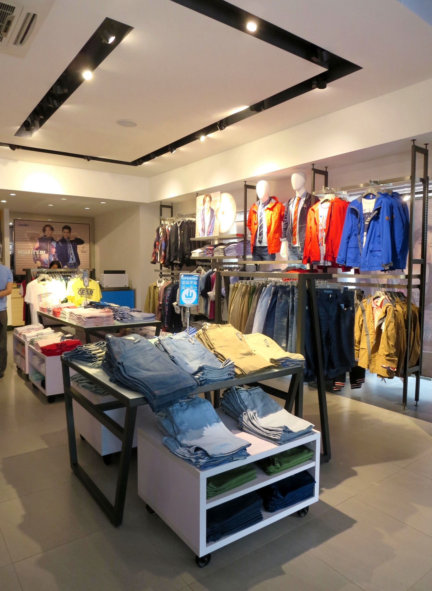 真維斯上海南京東路店面積150平方米,位于上海黃浦區(qū)南京東路。全新的真維斯LOGO以簡潔的形象體現(xiàn)品牌,傳遞出輕快美感,淺藍色的色彩運用獨具匠心;店內(nèi)裝修陳列更是時刻散發(fā)出年輕、時尚的氣息,店內(nèi)陳設顏色的互相搭配達到和諧統(tǒng)一,加強層次縱深感,動感、活力的元素在這里得到最大限度的詮釋。極具特色的櫥窗陳列展示了當季最新的潮流服裝,彰顯著真維斯品牌的形象:年輕、時尚、活力、自由。