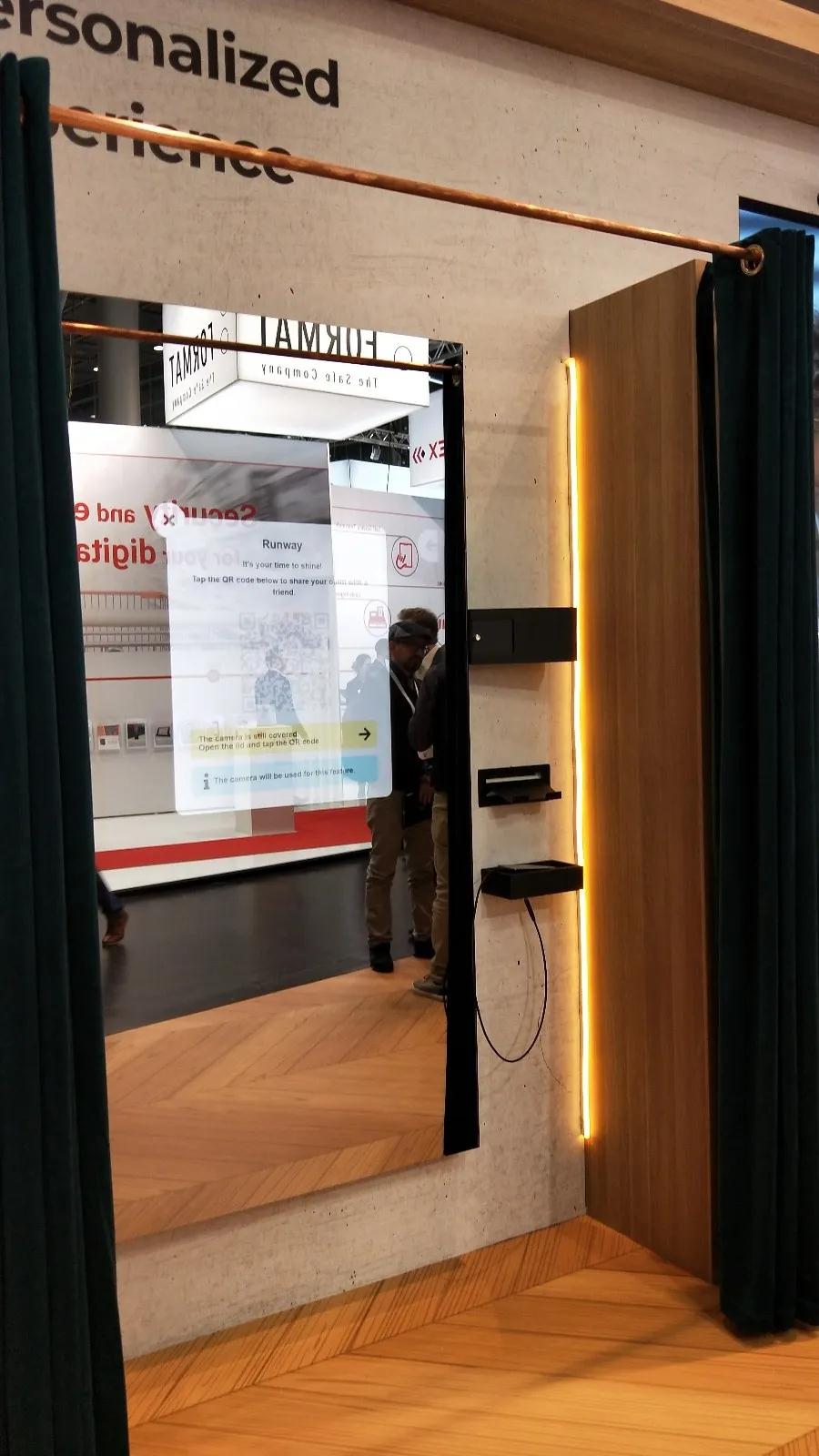 下面一組是智能試衣間,人在里面不但可以照鏡子,還可以選取與自己所選衣服合適的搭配(如帽子、眼睛、手套)并下單購(gòu)買。同時(shí),這個(gè)魔鏡有視頻錄制功能,可以360度全方位觀察自己所選衣物是否合身。如果需要更換衣物可以在不出試衣間的前提下提示服務(wù)人員為您送上合適的款式。