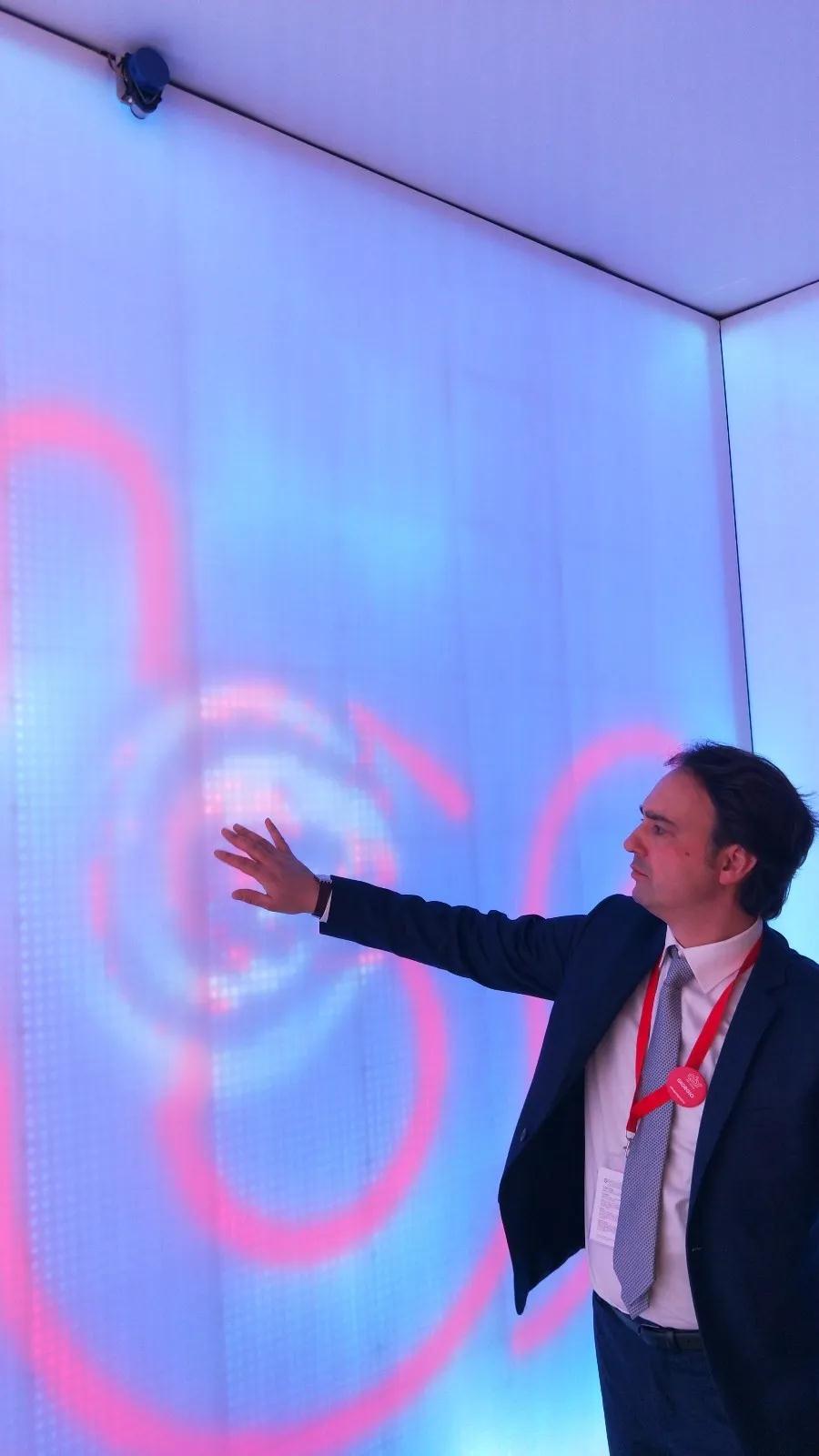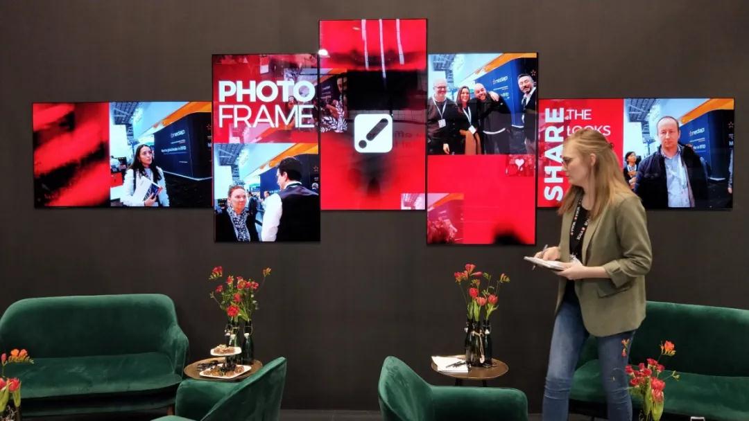 這組屏幕拼接方式很獨(dú)特,每塊屏幕大概只有10毫米的厚度。實(shí)時(shí)捕捉著現(xiàn)場(chǎng)參與體驗(yàn)的人群。