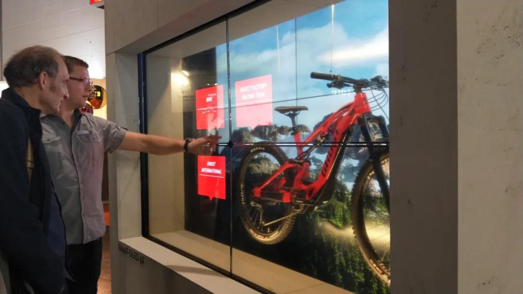 屏幕在零售店面設(shè)計(jì)中占據(jù)著舉足輕重的地位,是視覺(jué)傳播的主要陣地。LG品牌占據(jù)著主要的市場(chǎng)。鏡面屏、透明屏以及他們組成的拼接屏越來(lái)越得到廣泛的應(yīng)用。由四塊透明屏組成的櫥窗,兼具觸摸功能。當(dāng)人在距離兩米以上時(shí)顯示廣告(不透明),兩米以內(nèi)則變?yōu)橥该黠@示里面的自行車,同時(shí)觸摸上面的顏色模塊展示產(chǎn)品的各項(xiàng)信息數(shù)據(jù)。