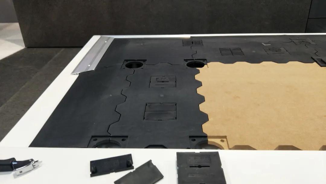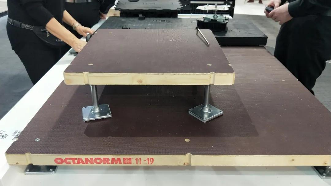 地面架空模塊。支座的調(diào)平可以在鋪設(shè)完基層板后進行,底部空腔走線,頂部可以做地毯、地膠、地板等飾面。