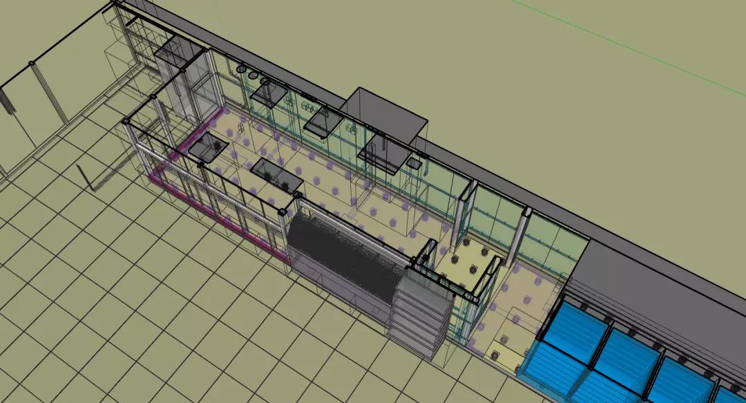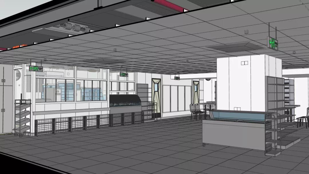 店鋪分為客區(qū)和廚區(qū)兩大區(qū)域,涉及到裝修、強(qiáng)弱電、給排水、通風(fēng)、空調(diào)、消防等多種專業(yè),涉及到甲方的家具和設(shè)備廠家10余家。設(shè)備數(shù)量共計(jì)30余種,僅強(qiáng)電面板插座就有150余個(gè)。專業(yè)交叉多,管線復(fù)雜,現(xiàn)場條件苛刻,疫情期間的各種管控帶來的人員管理和材料采購困難都是此次項(xiàng)目實(shí)施的難點(diǎn)。而“BIM+裝配式”就在此刻助力店鋪快速落地,精準(zhǔn)實(shí)施。