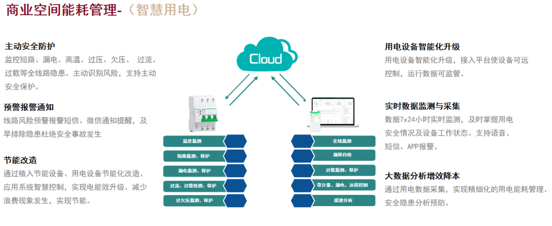 智慧用電:接入云平臺,通過用電數(shù)據(jù)采集,平臺數(shù)據(jù)存儲,實(shí)現(xiàn)精細(xì)化的用電能耗管理、安全隱患分析預(yù)防。