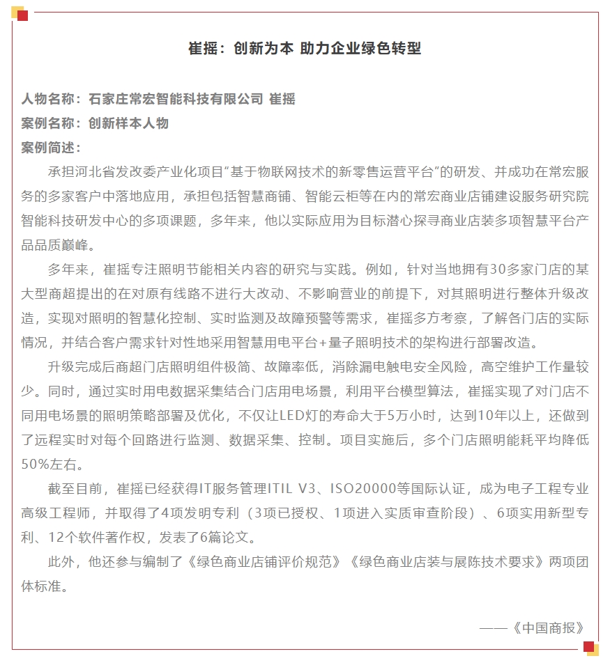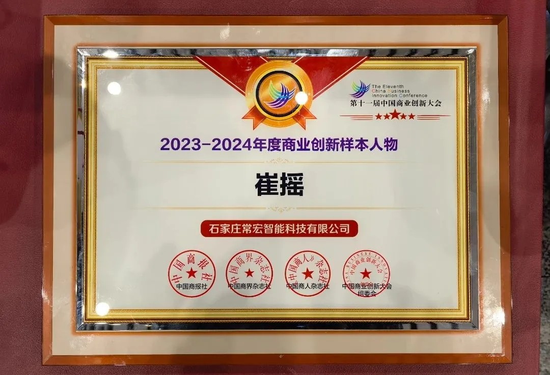 12月18日,在第十一屆中國商業(yè)創(chuàng)新大會上,對“2023-2024年度商業(yè)創(chuàng)新樣本優(yōu)秀案例”進行了表彰和頒獎。常宏集團榮獲“2023-2024年度商業(yè)創(chuàng)新樣本企業(yè)”;常宏智能科技有限公司董事總經理崔搖榮獲“2023-2024年度商業(yè)新銳創(chuàng)新人物”獎。