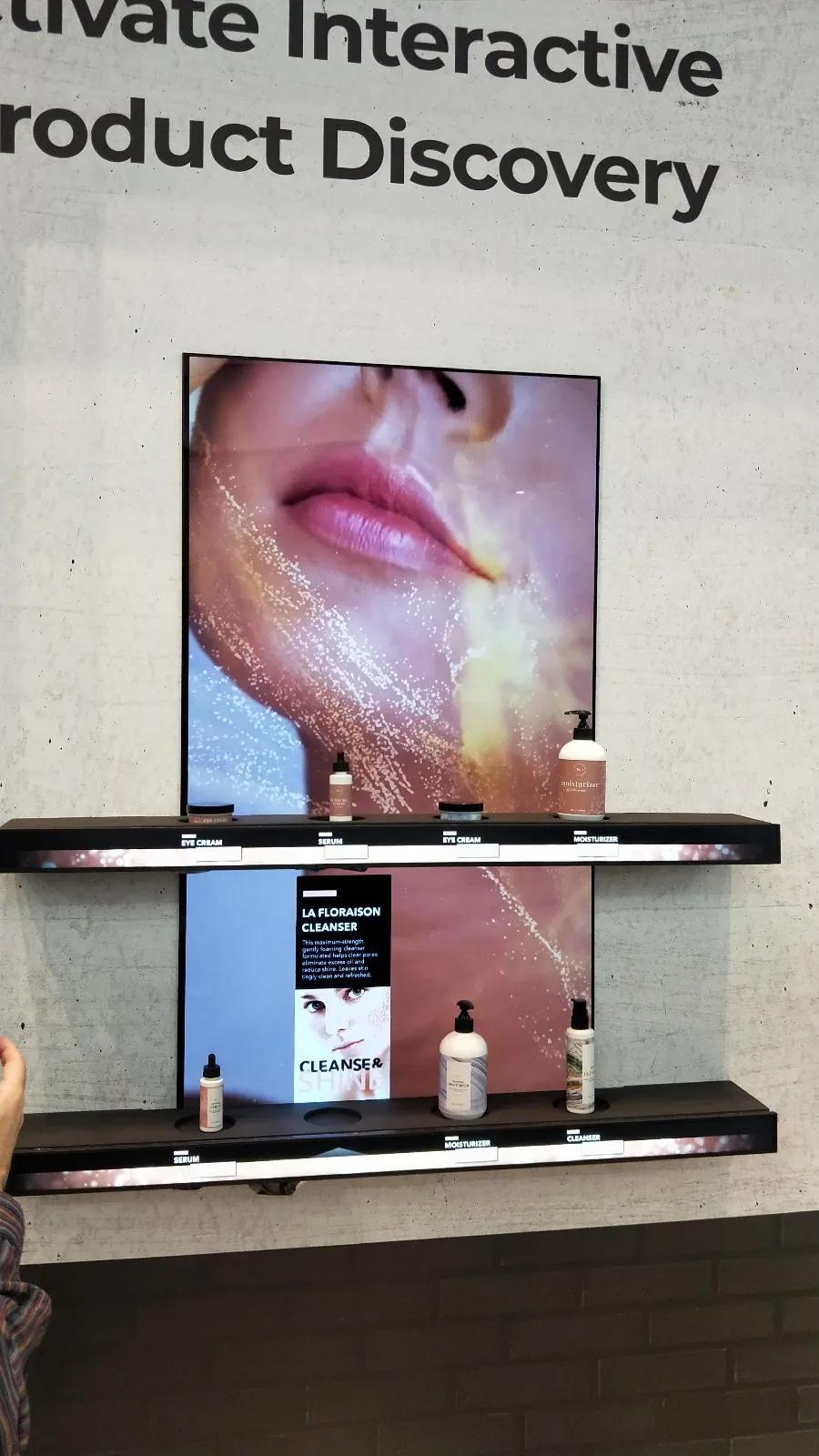 在它的旁邊是一款智能貨架,兩個層板上的產(chǎn)品均可以顯示價格,同時當產(chǎn)品位置發(fā)生變換的時候,價格也跟著調(diào)整。背面是一整塊大屏幕,閑時播放產(chǎn)品廣告遠距離傳播,當有產(chǎn)品被拿取的時候大屏幕會以畫中畫的形式展示所拿取商品的信息。